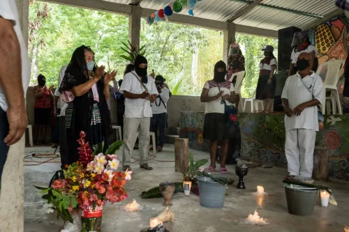 Roberto Barrios, Chiapas, 27 de abril 2021. Cuando el sol alcanzó el zenit, este 27 de abril a las doce del día, milicianos zapatistas surgieron y se posicionaron en círculo alrededor de la ceiba majestuosa situada en frente de la entrada del Caracol V “Que habla para todos”, sede de la Junta de Buen Gobierno “Nueva Semilla que va a producir”en el ejido Roberto Barrios, a media hora de Palenque en Chiapas, México. Se acercaron enseguida unas mujeres zapatistas hasta el tronco del árbol sagrado de los pueblos mayas y, en silencio, pusieron delicadamente sus manos en él, recordando las raíces profundas de la vida que defienden hasta la muerte. Ver más